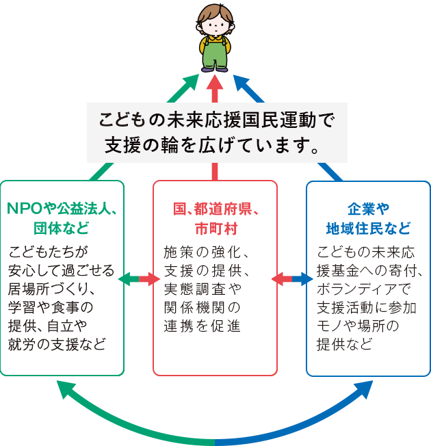 こどもが抱えている貧困の状況は多様で、見えにくいことから、貧困にある家庭やこどもへ、必要な支援を届けるためには、社会全体で取り組む必要があります。政府は、支援したい人や企業と、草の根でこどもたちを支えているNPOなどの団体を結びつけ、国や自治体が行う施策を促進させる「こどもの未来応援国民運動」を2015年にスタートさせました。