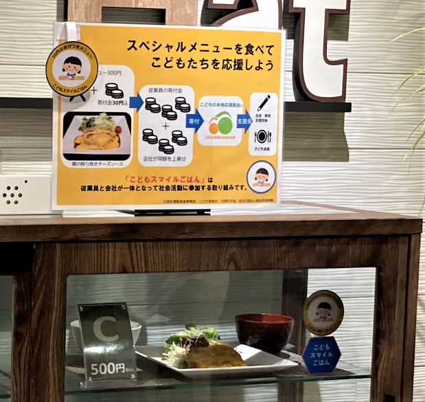 「こどもスマイルごはん」は、メインのおかずにご飯と汁物がついたセットメニューで、一食当たり500円の販売価格に30円の寄付金が含まれており、本メニューの販売を通じて集まった寄付金に、同社が同額を上乗せした合計金額を「こどもの未来応援基金」にご寄付くださるという取組です。
