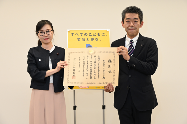 「こどもの未来応援基金」への令和5年度中のご協力に対して、加藤大臣から感謝状を贈呈しました。
