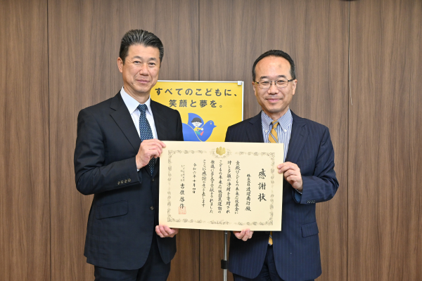 令和5(2023)年度中に「こどもの未来応援基金」に多額のご寄付をされた企業に対し、10月4日、吉住啓作支援局長から感謝状を贈呈しました。