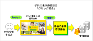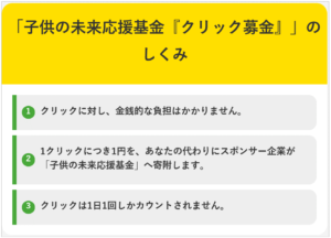 クリックする皆さまに金銭的負担はなく、基金にご賛同いただく賛同企業が皆様に代わって、1クリック1円を「こどもの未来応援基金」へご寄付いただきます。