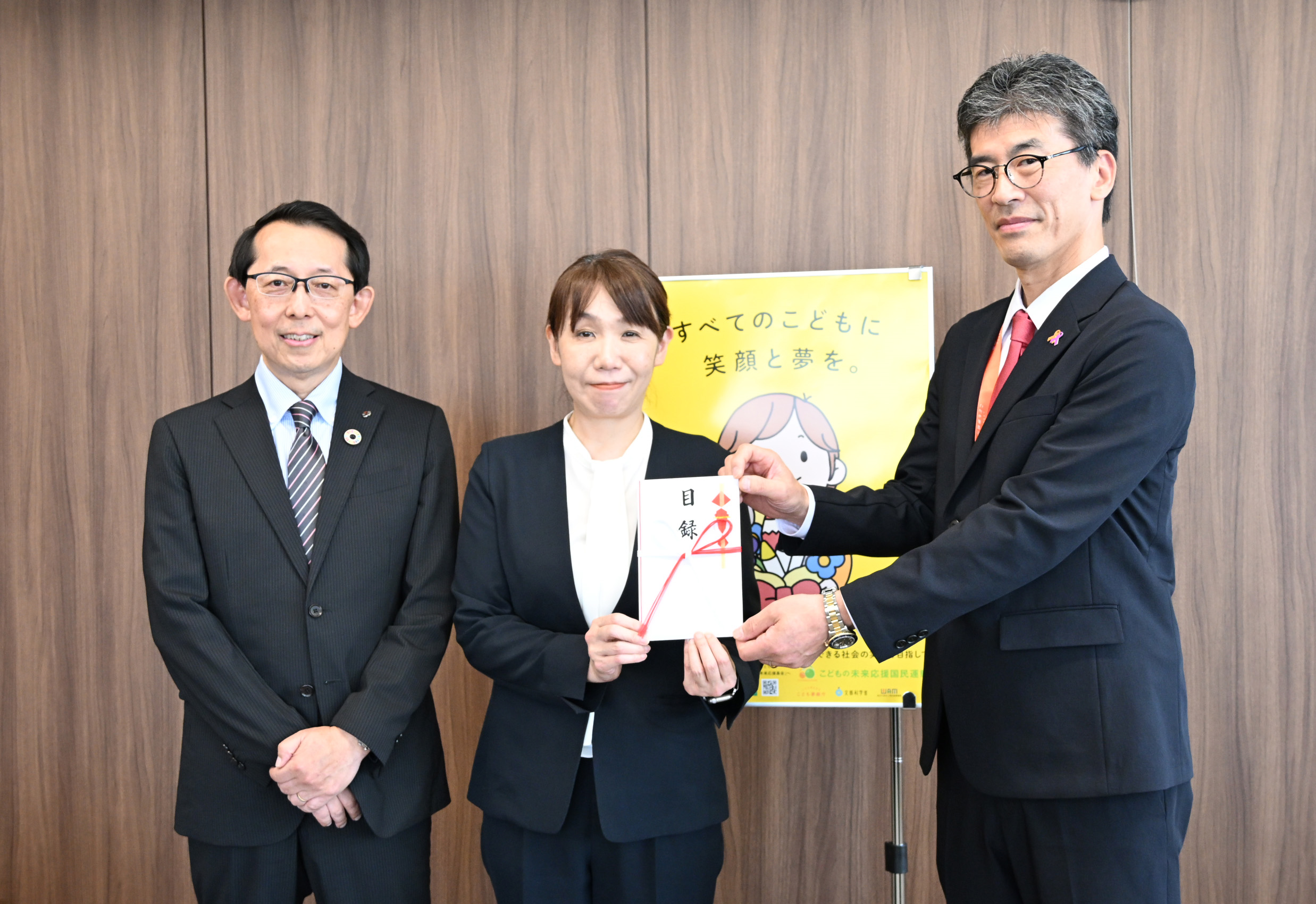 寄付目録を贈呈するセブン&アイ・フードシステムズ総務部の大江清彦部長(左)、イトーヨーカ堂サステナビリティ推進部の小山遊子総括マネジャー(中央)と、受け取るこども家庭庁の齊藤馨支援局長(右)