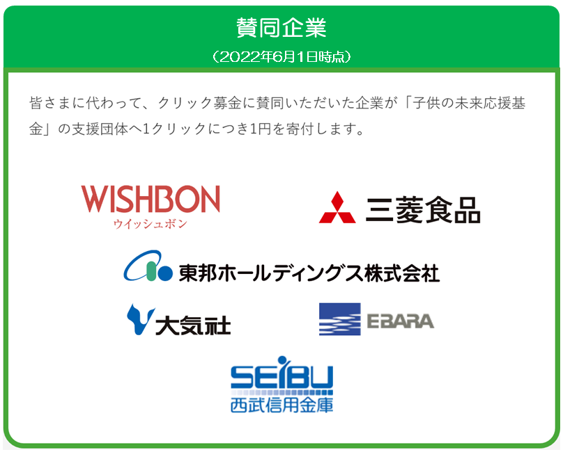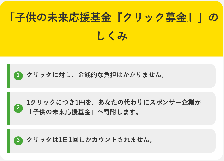 クリックする皆さまに金銭的負担はなく、基金にご賛同いただく賛同企業が皆様に代わって、1クリック1円を「こどもの未来応援基金」へご寄付いただきます。