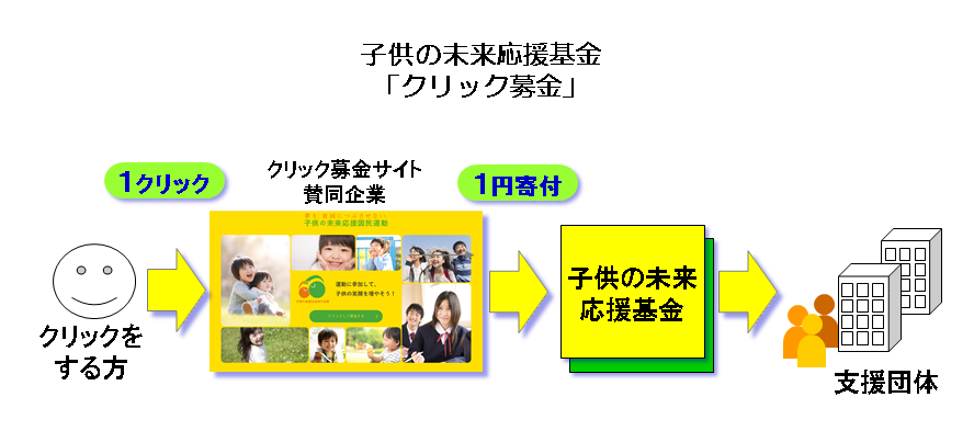クリックする方の支援の思いを、賛同企業が代わって「子供の未来応援基金」を通じて、子供の貧困に取り組む支援団体につなげます。