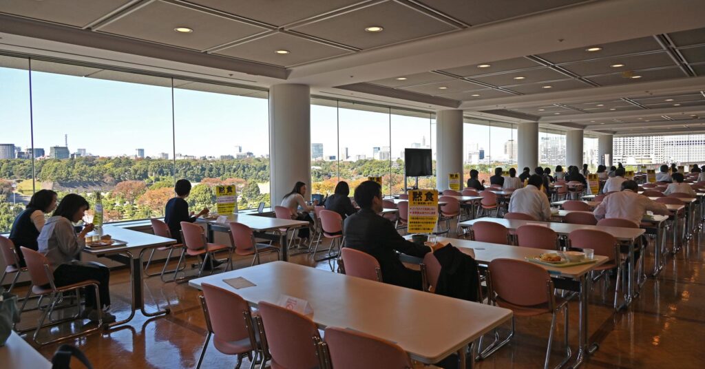 日比谷本社の食堂。コロナ対策のため「三密」を避ける配慮が。