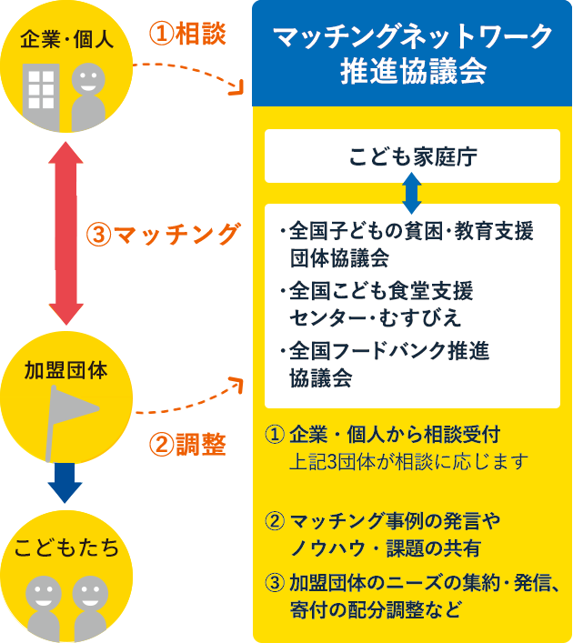 「こどもたちに寄付・支援をしたいけれど、どの支援団体に協力すればいいかわからない」といった企業・個人の方のために、こども家庭庁は「マッチングネットワーク推進協議会」を通じて、支援団体の全国ネットワークを持つ3つの団体と連携し、寄付先等との調整(マッチング)を行っています。