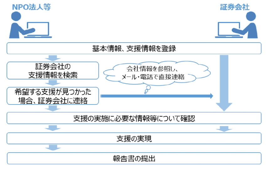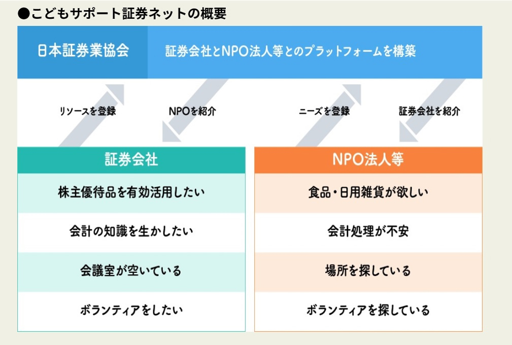これは、NPO 法人等は受領を希望する支援を、証券会社は提供できる支援をそれぞれウェブサイト上に登録し、相互に登録内容の閲覧や交流ができる、いわば子供の貧困対策に取り組むNPO法人と、物品等の支援が可能な証券会社のマッチングを図る仕組みです。