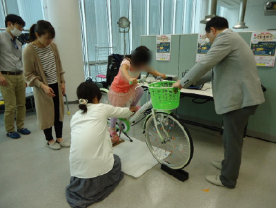 しゃいん食堂プログラムでは、地域の企業の協力のもと様々な職業体験を通じ子供たちの職業観を培います。写真は自転車で発電する体験をしている様子です。