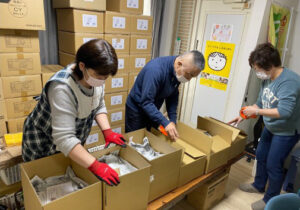 ボランティアスタッフがフードバンクに集まっている食品をバラエティ豊かに丁寧に小包の梱包をします。