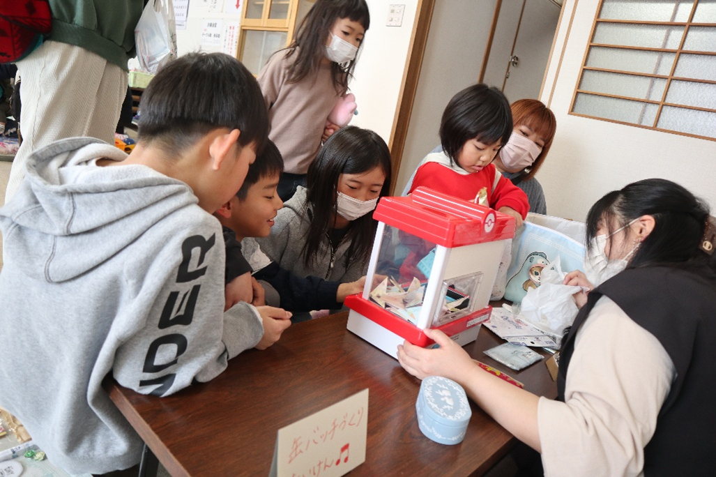 食後のお楽しみ、クレーンゲーム。紙に書かれた数字の分だけ好きなお菓子を持ち帰っていただいています。