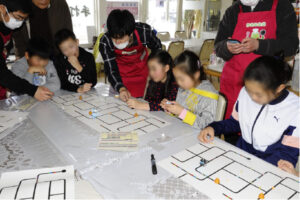 かえる食堂で実施した小型ロボット「オゾボット」を使ったプログラミング学習勉強会。地元の専門学校の生徒がボランティアとして参加してくれました。