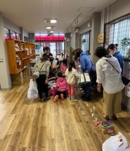 フードパントリー会場でお菓子釣りをして遊ぶ子供たち。写真左手には、無料のカフェコーナーもあります。
