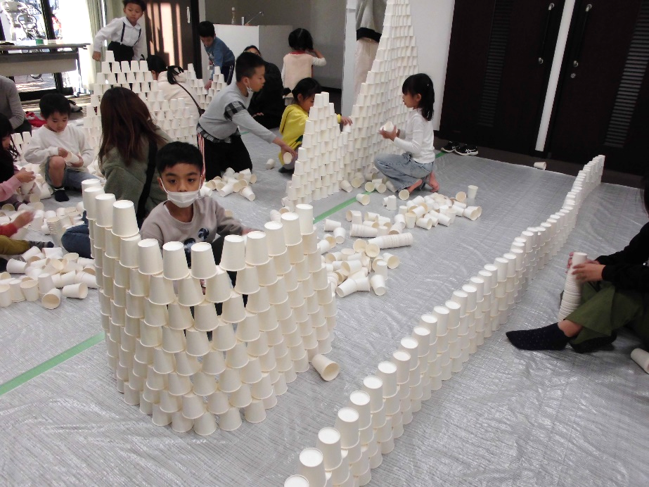 紙コップを高く積んだり、お家を作ったり、みんなで力を合わせて大きな作品が出来上がります。