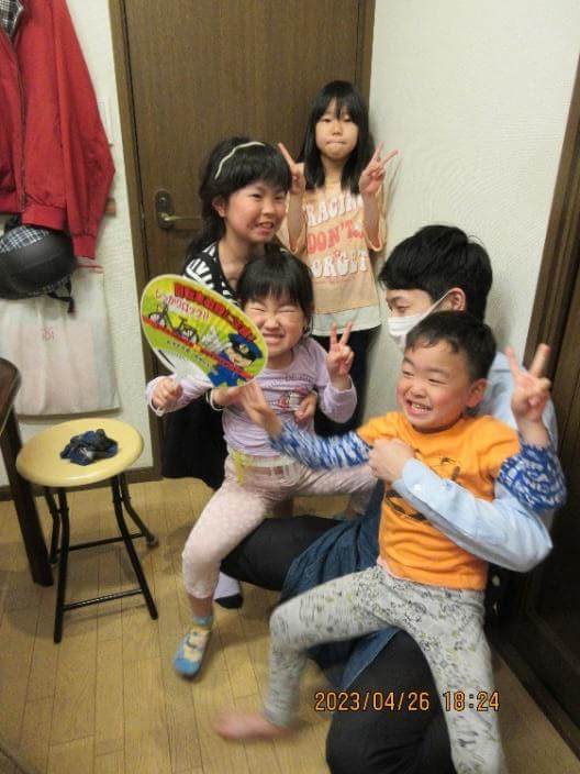 こども食堂開催日に夕食後、ボランティアと戯れているこどもたち。皆嬉しそう‼