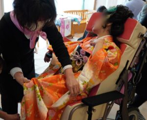 障がいのある方には、お体に負担をかけないように気をつけて着付けをおこなっております。