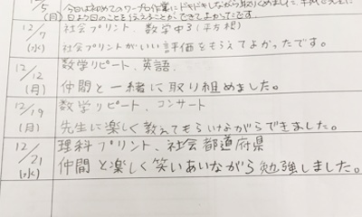 活動のあとに生徒が記入する振り返りシート。この感想を次の指導に生かしています。また、友人同士で一緒に考え合う姿がよく見られます。学力だけでなく、心も育てていきたいと考えています。