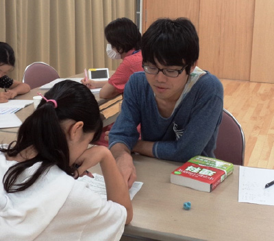 大学生ができるだけ、一人ひとりに寄り添って、わからないところを教えるようにしている。(UR団地集会室にて)