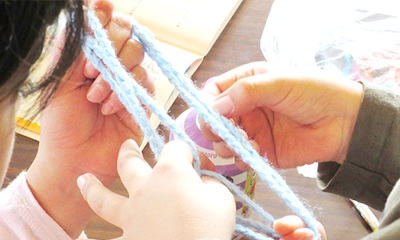 土曜寺子屋では、学習指導だけでなく、遊びにも真剣に取り組みます。指導員と子供たちの間では、あやとりがブームになっています。