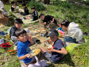 春休みのお預かりの日、お花見をしながらみんなで作ったランチを食べました。外で食べるランチは格別!みんないい笑顔です!