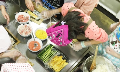 子供たちが真剣な眼差しで手巻き寿司に挑戦しました。初めて取り組む子供が多く、みんなで楽しく盛り上がりながら調理できました。