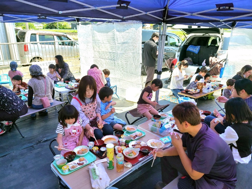 「こども食堂」「料理教室」は野外にテント、机、イスなどを設置して開催。年齢・性別・国籍の枠を越えて交流し、助け合っています。