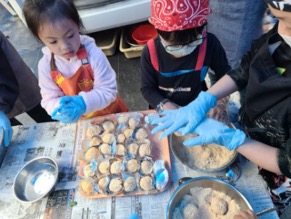 「料理教室」でこども食堂のメニューのおはぎを作っている様子。幼児から高校生までみんなで楽しく調理している。