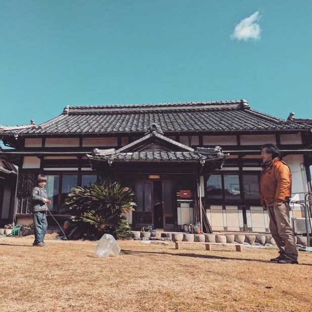ユースセンターの日に、スタッフとこどもが凧揚げをしている様子