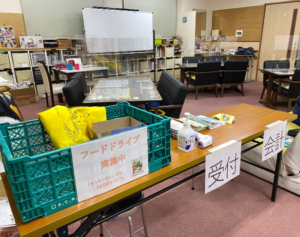 ワンフロアで場所を分けて、昼食支援・学習支援・食料支援を実施しています。この写真は手前受付、奥は学習支援の場所です。