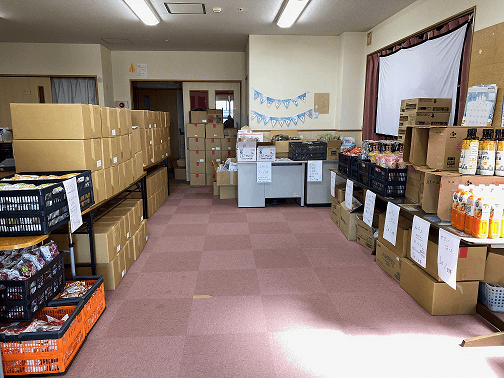 食料支援の様子。完全予約制。30世帯限定。弥富市在住のこどもをもつ家庭対象。1家庭、段ボール1箱+α。