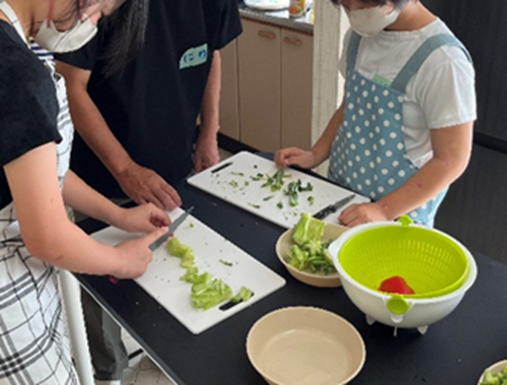 居場所での昼食づくりでは地域の方に調理をお願いしています。その様子を見ながら、「やってみたい」という気持ちを育みます。