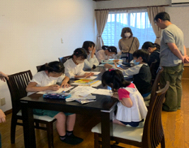 鈴鹿市内での学習支援の様子。スタッフ3名とボランティア2名での開催。雨にも関わらず元気に過ごしてくれた。