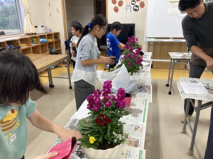 「学ぼう会」で外部講師と寄せ植えをするこどもたち。