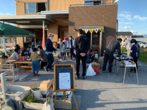 子供食堂では、毎回40人程度の参加があります。密を避け、屋外にもテーブルを設置し、年齢の枠を超えて楽しく交流しています。