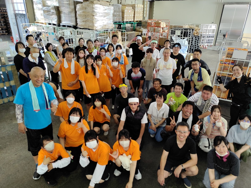 夏休みこども支援プロジェクト出荷作業後のボランティアとの集合写真
