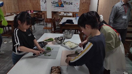 4/12の自炊塾で野菜を切る小学生と指導する高校生、この日は2種類の味のパスタです。この日の参加者こども11名、大人6名でした。