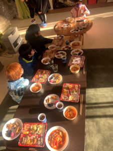 里山活動拠点「はしもとベース」にてお泊り会時のごはんタイム。調理スタッフの手づくりのお弁当をみんなで食べます。