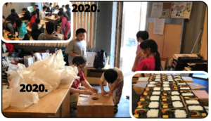 2020.5~弁当を受け取る地域の子供たちです。右下は30食/回の手作り弁当です。
