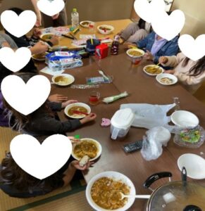 子供たちと一緒に作ったカレーをたべています。保護者さんとも信頼関係があるので世帯介入も実施します。