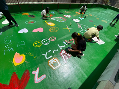 塗装が剥がれていた屋外テラスのリノベーションを実施。塗り直した地面にペンキでみんなで自由にお絵かきをしました。