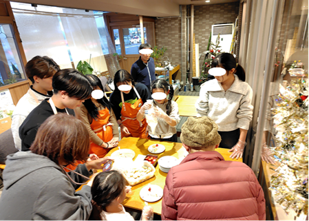 食後にケーキのデコレーションに挑戦してもらいました。こども達とボランティアの大学生とシニアの方々が一緒に参加しました。