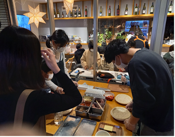 「わいわいワイキ食堂」の写真。この日のメニューは「ピザづくりを楽しもう」で、ピザ生地に思い思いにトッピングしている。