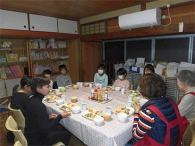 てらこやワイワイクッキング みんなでご飯を食べています。家族でない大人に誉めてもらうことで子供たちは元気になります。「自分でできることをやってみる」そんな気持ちになります。ほとんどの子供が登校できるようになりました。
