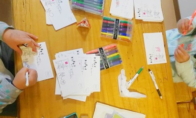 学習の合間に、一生懸命メッセージカードを記入している子供たち。