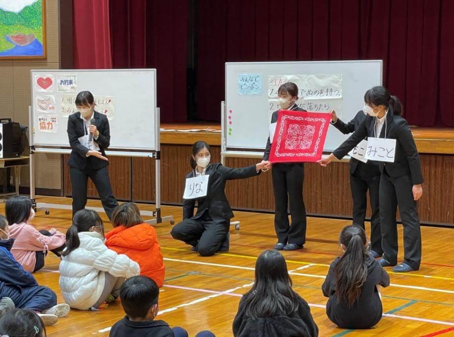 「みんな、これからゲームをするよ」と、 大学生ピアサポーターとこどもたち