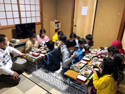宿題もすませて、みんなで楽しく”あつあつごはん”を食べています。食事後はみんなで室内ゲームをやります。
