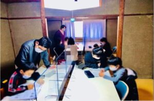 みんなで宿題をしています。宿題が済んだらお楽しみの手作りお弁当をいただきます。