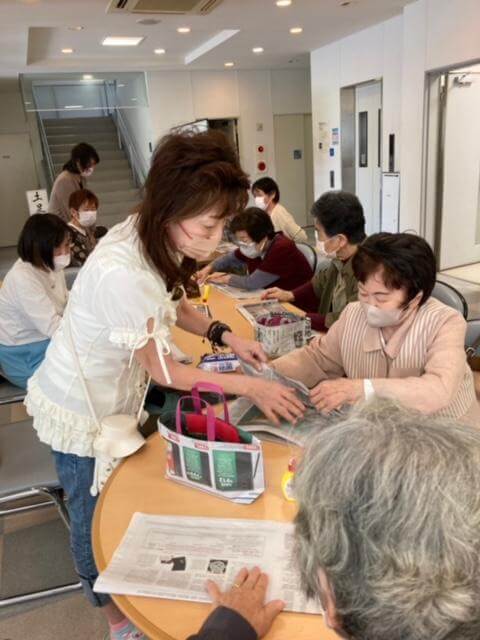 カフェの開催時に英字新聞で鞄を作製している様子