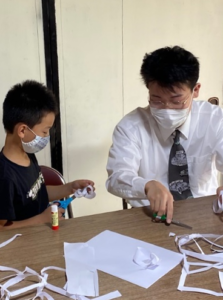 この日「まなびば」ではメビウスの輪を研究しました。参加した学生さん達も、子供たちと一緒に考えを深め合ってくれています。