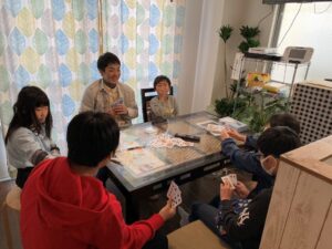 寺子屋で勉強の合間にみんなでトランプをして交流をはかる様子