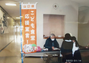 子供食堂の受付で出席児童の確認・検温をしている様子です。山口県からいただいた「子ども食堂応援宣言」ののぼり旗が目印です。